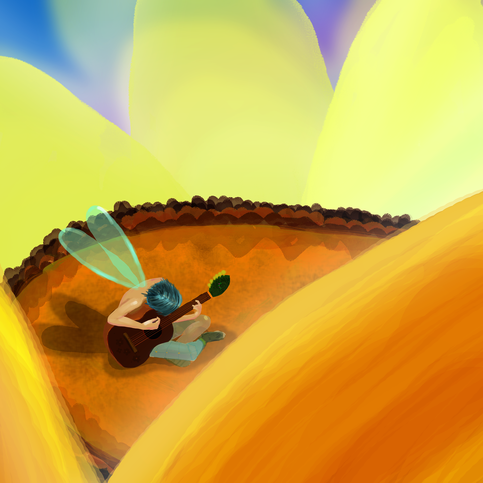 Fairy boy playing guitar inside a sunflower